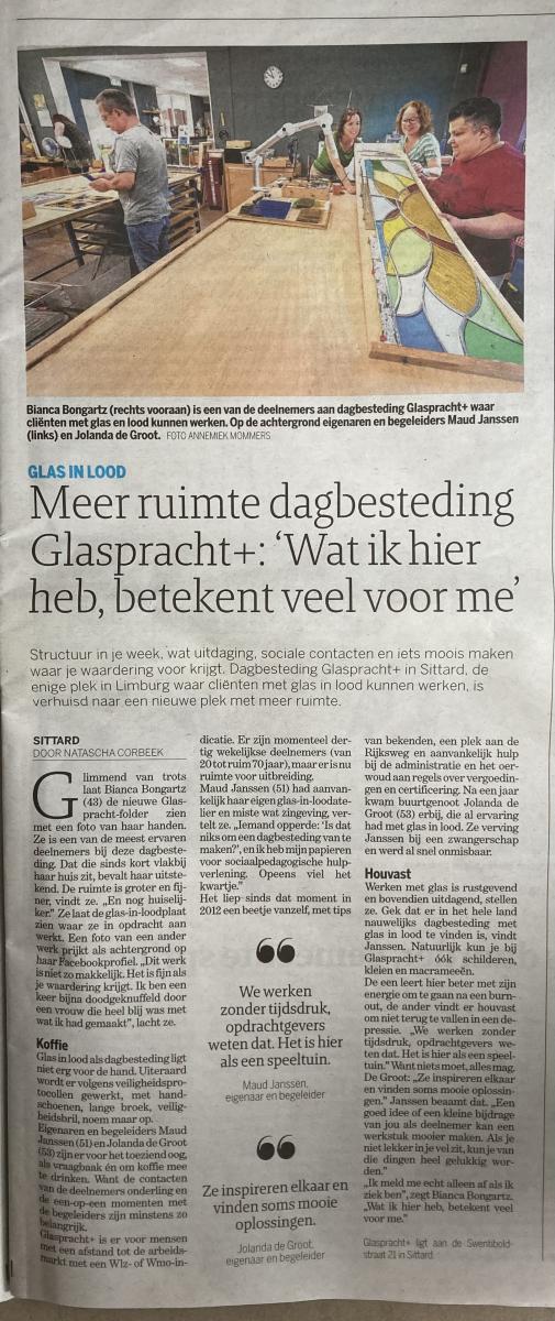 "Ik vind het fijn dat ik in mijn eigen tempo kan werken aan datgene waar ik op dat moment behoefte aan heb. De ene keer iets heel kleins om iemand cadeau te geven, en de andere keer bijvoorbeeld werken aan een opdracht. Het hoeft ook niet altijd glas te zijn, soms zit ik te kleuren of te diamondpainten o.i.d. Ik voel me altijd welkom en gehoord. De begeleidsters oordelen niet, dat voelt veilig genoeg om altijd mezelf te zijn!"